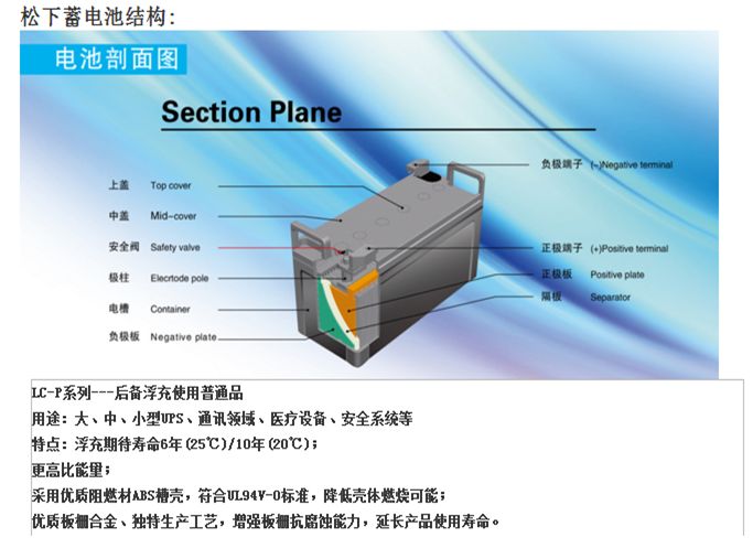 7、壽命長:由于采用高純原材料及長壽命配方、電池組一致性控制工藝,松下蓄電池正常浮充設(shè)計(jì)壽命可達(dá)6~10年。